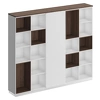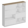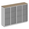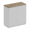 Комбинированные столешницы с нижней частью в цвет корпусов опорных тумб. Заглушка кабель-канала в столешницах столов с двусторонней крышкой: с одной стороны серебристого цвета, противоположная сторона с панелью в цвет столешницы. Вертикальная опора-колонна стола на квадратном утяжеленном основании, шлифованная нержавеющая сталь. Фасады: двери и выдвижные ящики без ручек с системой открывания Push to Open (нажал-открыл). Стеклянные двери в алюминиевой рамке в декоре «нержавеющая сталь» выполнены из матового стекла «белый сатин». Цоколи опорных тумб и шкафов выполнены из металлизированного пластика HPL в декоре «нержавеющая сталь».