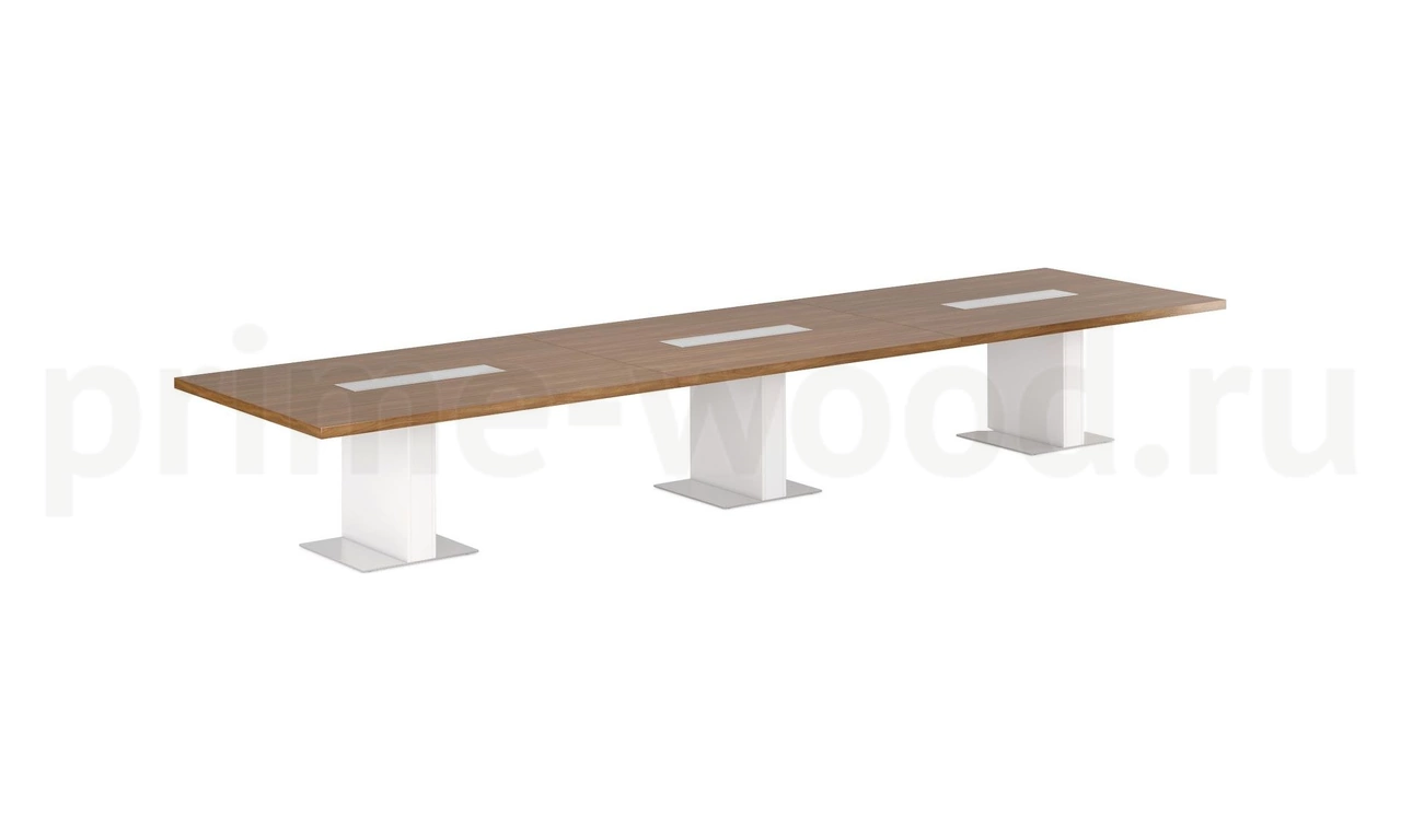 Столешница толщиной 38 мм, которая опирается на белые опоры с металлической пластиной в основании. Внутренний коммуникационный блок с 3 розетками 220 В, 1 телефонной розеткой и 1 розеткой для подключения интернета.