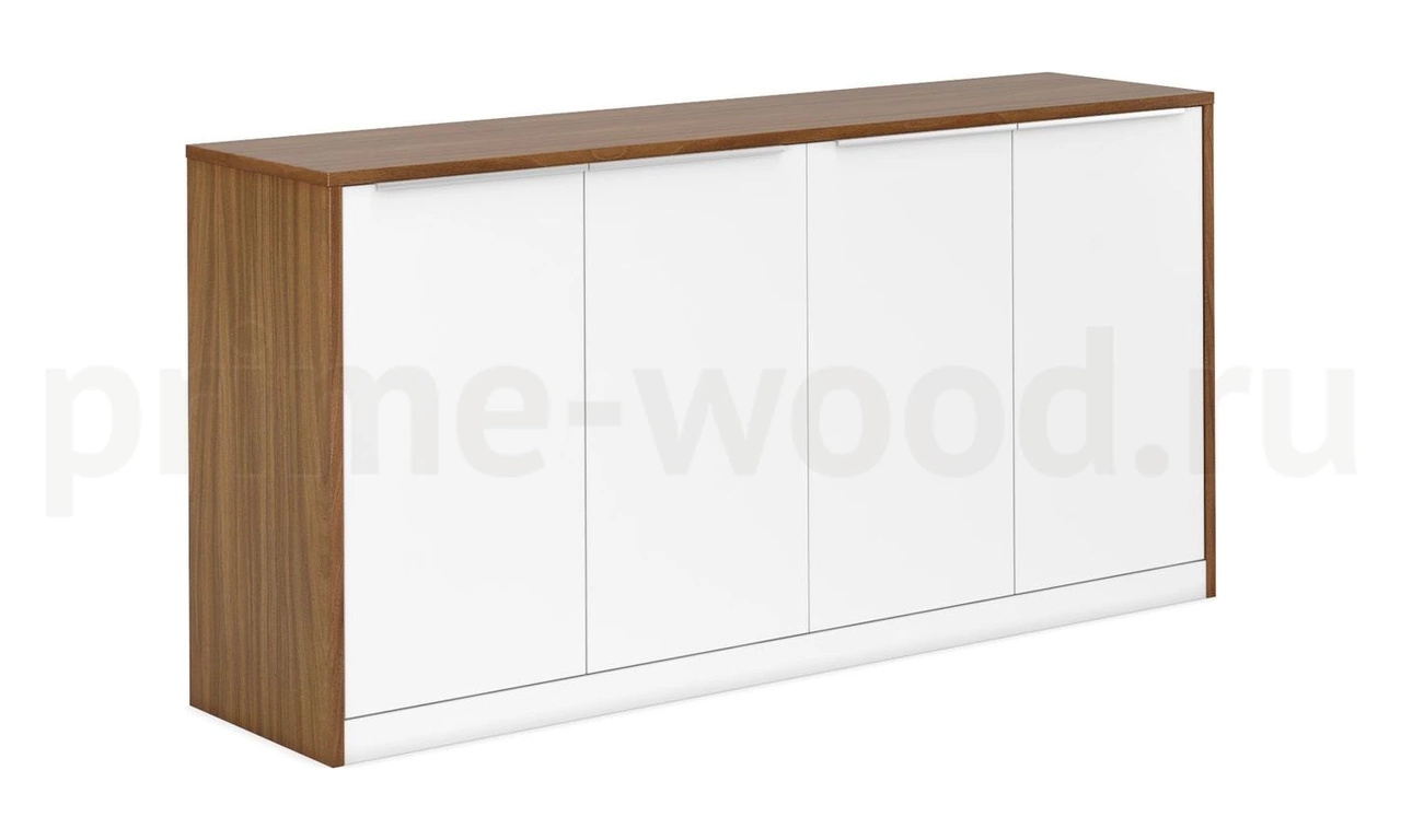 Низкий шкаф, 4 белых глянцевых двери, ручки - алюминиевые. Внутренняя часть шкафа - белая.