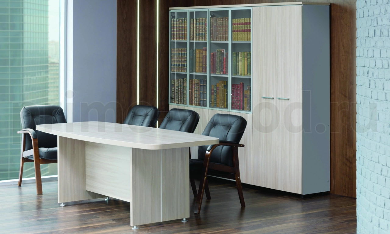 • Толщина: Столешниц столов письменных, приставок подкатных, брифинг-приставок - 41 мм, опор столов - 32 мм, топов тумб и шкафов - 25 мм, детали корпусов тумб, шкафов и дверей - 16 мм