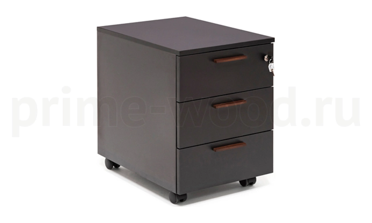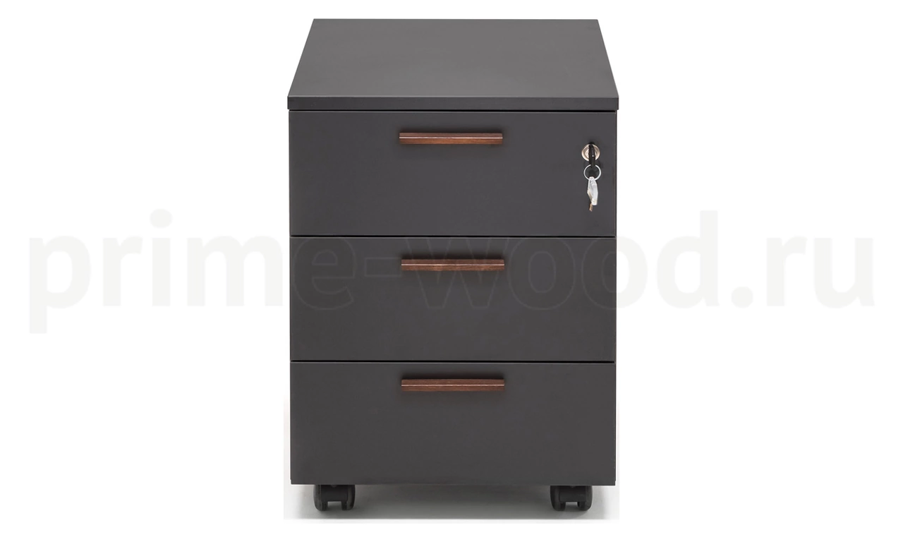 Каркас тумбы выполнен из черного матового ЛДСП 18 мм. На верхнем фасаде выдвижного ящика установлен центральный замок. Металлические выдвижные ящики оснащены системой плавного закрывания. Ручки – массив дуба, тонированные в основной цвет коллекции.